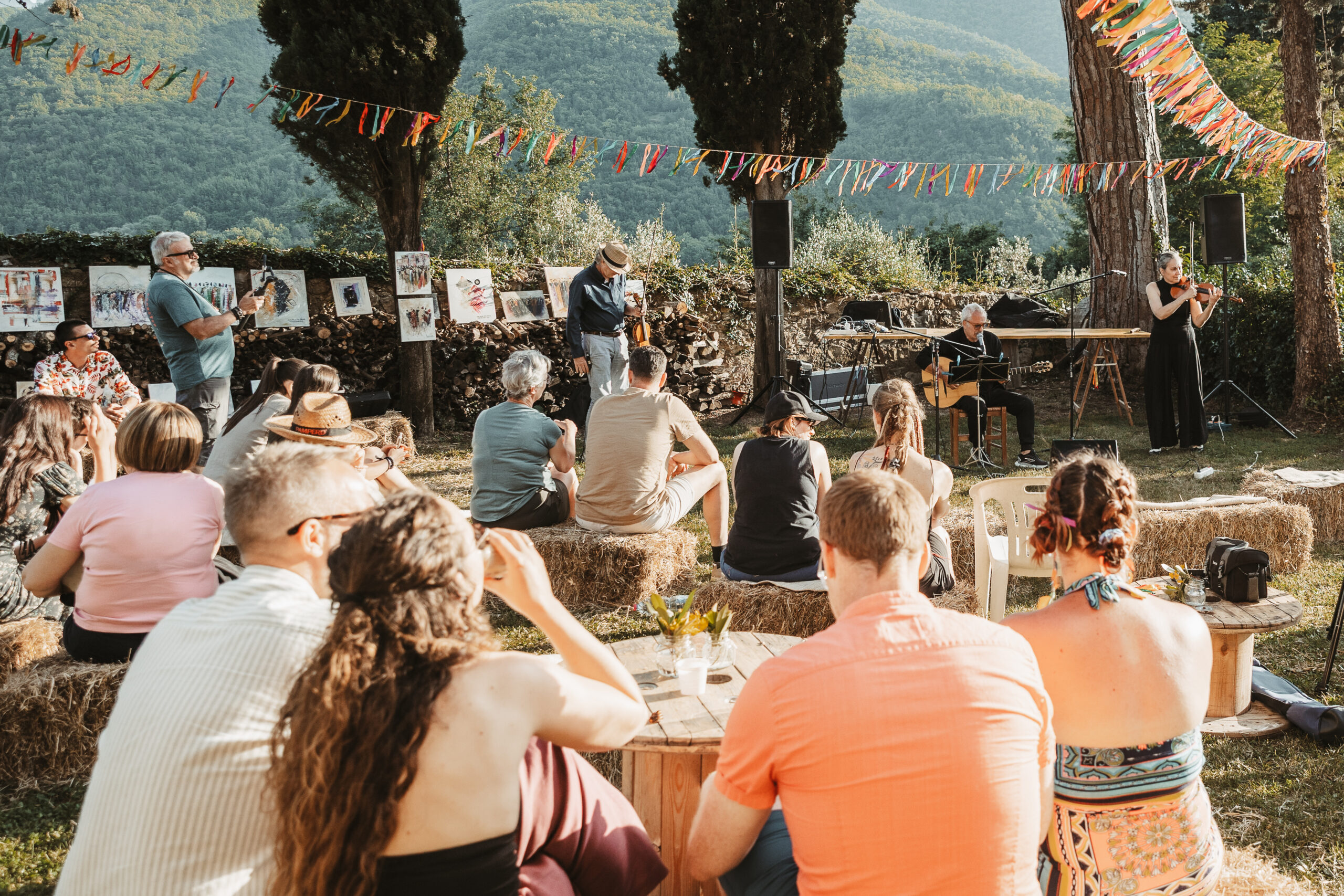 Toen het moment daar was, werd alles rustig en ontspannen. Alles was klaar en geregeld en ze konden echt van hun moment genieten. En dat deden ze. Daar, in de bergen van Toscane. De ceremonie vond plaats in een open veld, omringd door bergen, olijfbomen en cipressen. De gasten zaten in een ruime kring op dekens en kussens. Drie vrienden leidden de ceremonie. Er werd gesproken in het Engels (met dat heerlijke Italiaanse accent 😍), Italiaans en Nederlands. Er waren lieve woorden, vioolmuziek en een zon die enorm haar best deed. Fotografisch gezien best een uitdaging met zon en schaduw door elkaar… maar wat een moment. Genieten. En zweten 😅