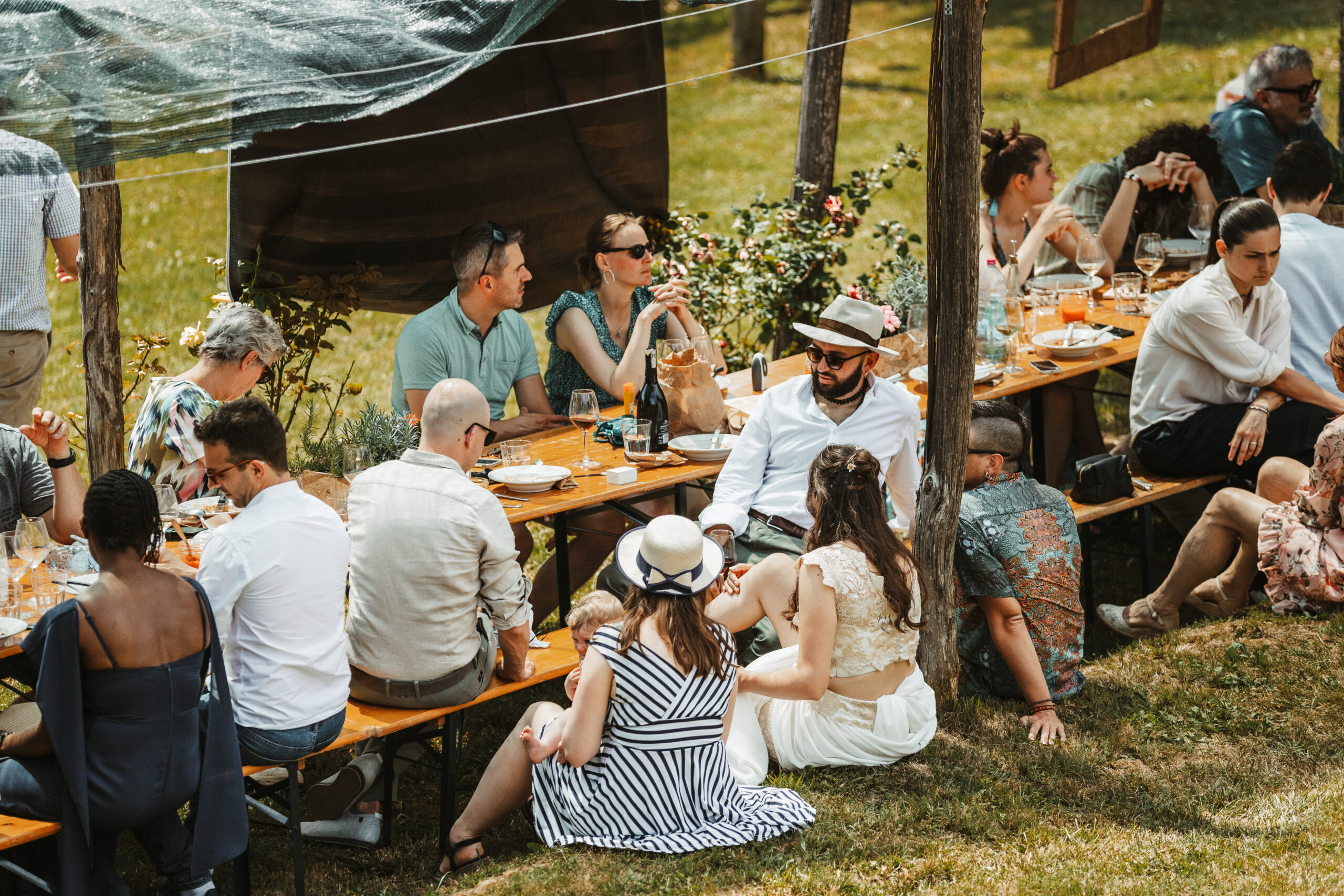 Na de ceremonie werd uiteraard het glas geheven en vloeide de vino rijkelijk 🍷 Zelfgemaakte hapjes verschenen en daarna schoof iedereen aan voor de lunch. Eén lange picknicktafel voor zo’n tachtig gasten, gevuld met de heerlijkste Italiaanse gerechten, water en wijn. Zo kleurrijk. Zo feestelijk. Een feestje om te fotograferen. En om mee te maken. Er werd urenlang genoten. Na de lunch verscheen er een Piaggio gelato karretje met ijs, koffie en zelfgemaakte limoncello. Dat moest ik natuurlijk even proeven. OMG 😍 echt zó lekker.